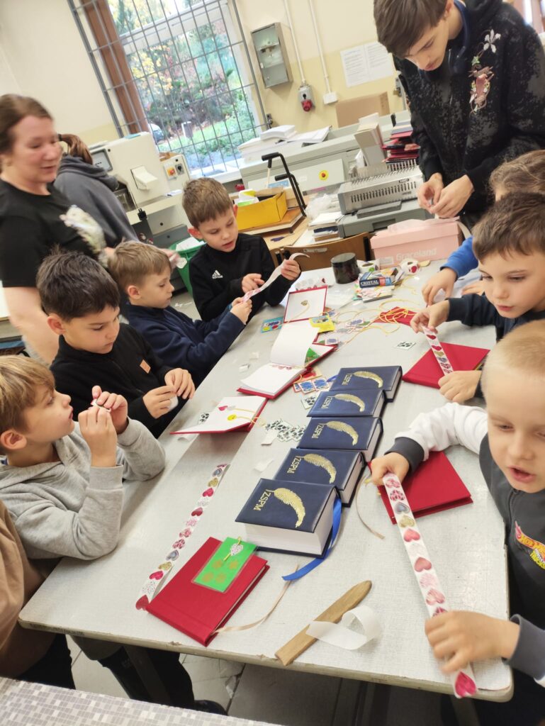 30 października grupa JEŻYKI z Przedszkola Samorządowego nr 178 wzięła udział w warsztatach introligatorskich pt. „Sztuka użytkowa z papieru” w Zespole Szkół Poligraficzno-Medialnych. Dzieci wykonały zakładki do książek (ozdobiły, zalaminowały i przykleiły na sznurku do notesu), a następnie ozdobiły wg własnego pomysłu notesy.